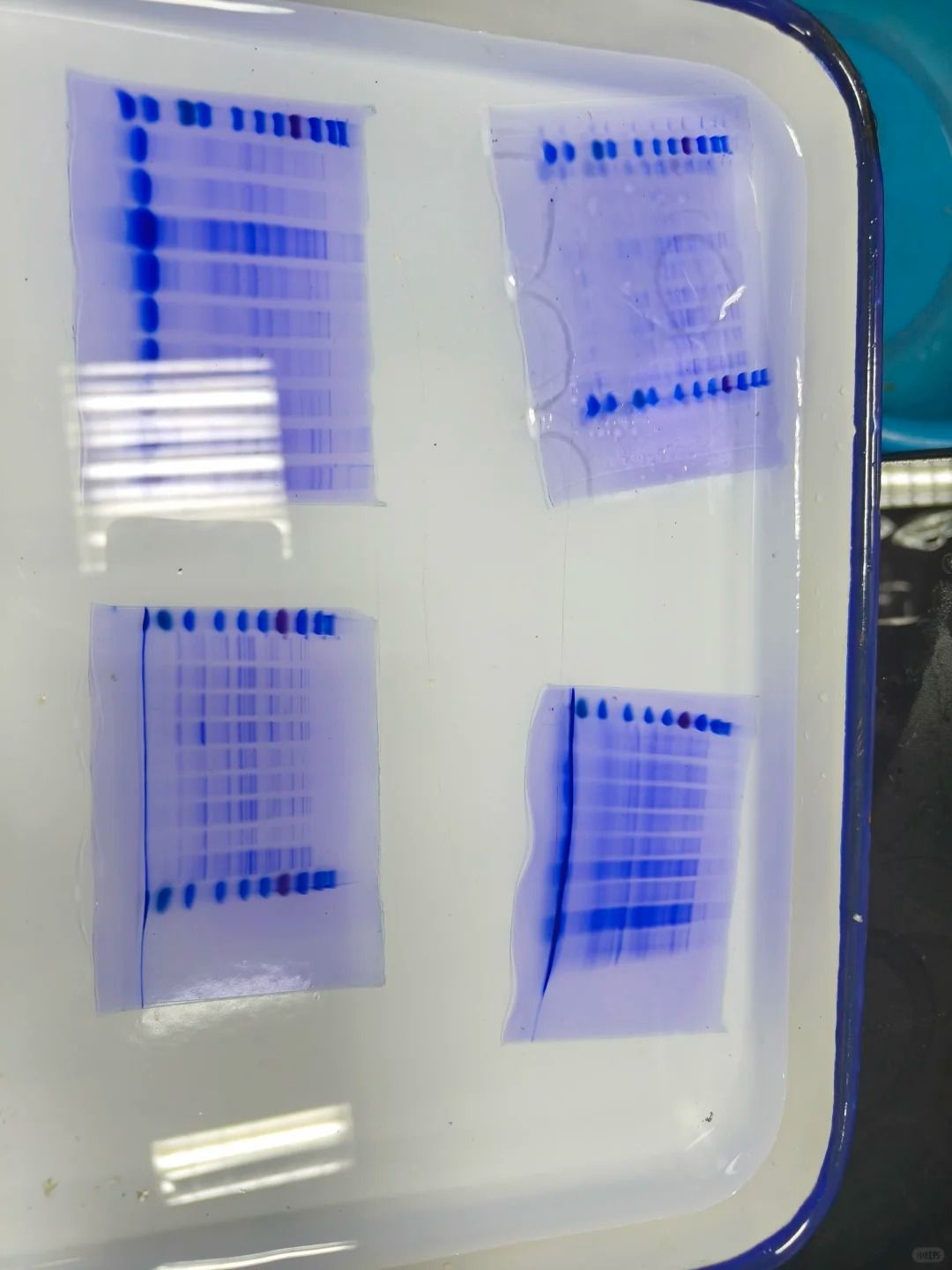 染色并脫色至獲得清晰的藍(lán)色條帶和干凈背景后,可將凝膠放置在7%的乙酸中保存。