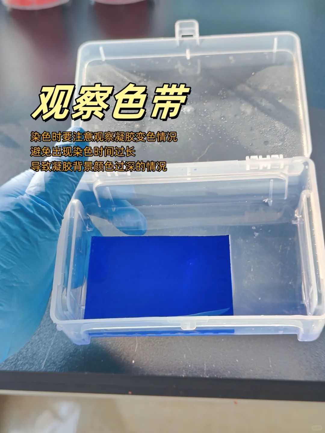 ▲觀察染色情況:在染色過程中,要時(shí)刻注意觀察凝膠的變色情況。當(dāng)看到清晰的蛋白質(zhì)染色條帶時(shí),就說明染色已經(jīng)差不多了。這時(shí)候,就要及時(shí)停止染色,避免背景顏色過深。