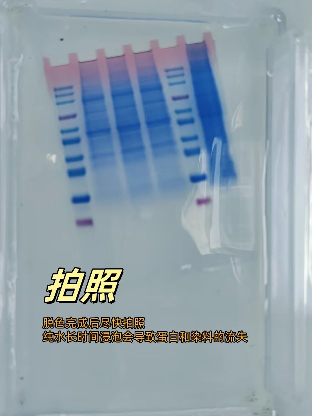?▲調(diào)整去染時(shí)間?:去染時(shí)間的長短會(huì)影響背景顏色的深淺。一般來說,去染時(shí)間越長,背景顏色越淺。你可以根據(jù)實(shí)驗(yàn)需求調(diào)整去染時(shí)間,直到背景清晰、蛋白質(zhì)條帶清晰可見為止。