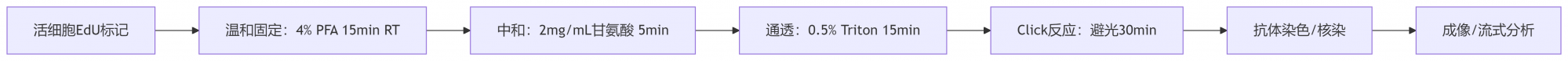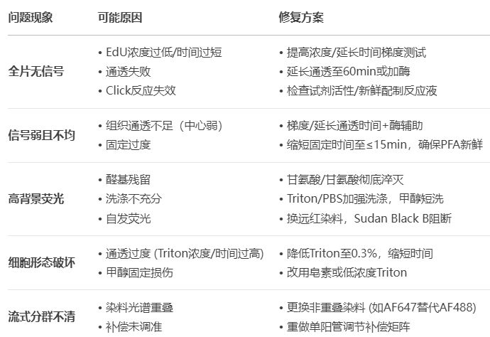 →固定: 使用新鮮配制、pH 7.4的4%多聚甲醛(PFA),室溫固定≤15分鐘。過度固定(>30min或高濃度戊二醛)會嚴重遮蔽抗原和EdU位點。