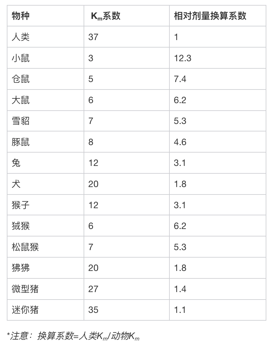 根據(jù)美國FDA《Estimating the Maximum Safe Starting Dose in Initial Clinical Trials for Therapeutics in Adult Healthy Volunteers》,常見物種的Km系數(shù)以及相對劑量換算系數(shù)如下表: