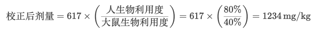 示例:延續(xù)上面的示例,剛剛我們計算出大鼠理論劑量是617mg/kg,假設目標藥物在人體的口服生物利用度為80%,而在大鼠中僅為40%,生物利用度校正的計算過程如下: