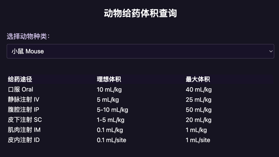 選擇所用動物種類,就可以查詢到該物種不同給藥途徑的理想給藥體積。