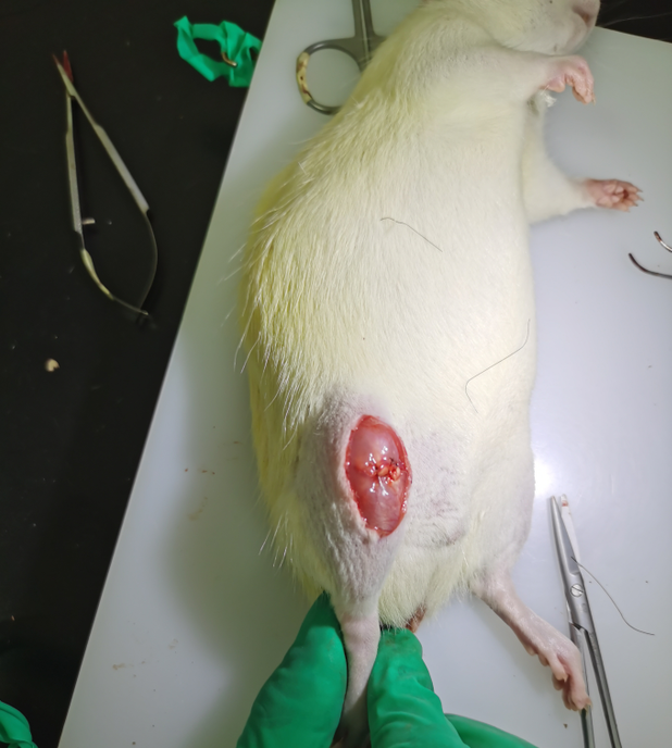 2、麻醉后大鼠右后肢備皮消毒,在膝關(guān)節(jié)炎內(nèi)側(cè)做一個縱向約3cm的切口,沿髕骨韌帶向上輕開一個小口,剪開肌肉,屈膝,將髕骨外翻。暴露交叉韌帶后,剪斷前交叉韌帶。