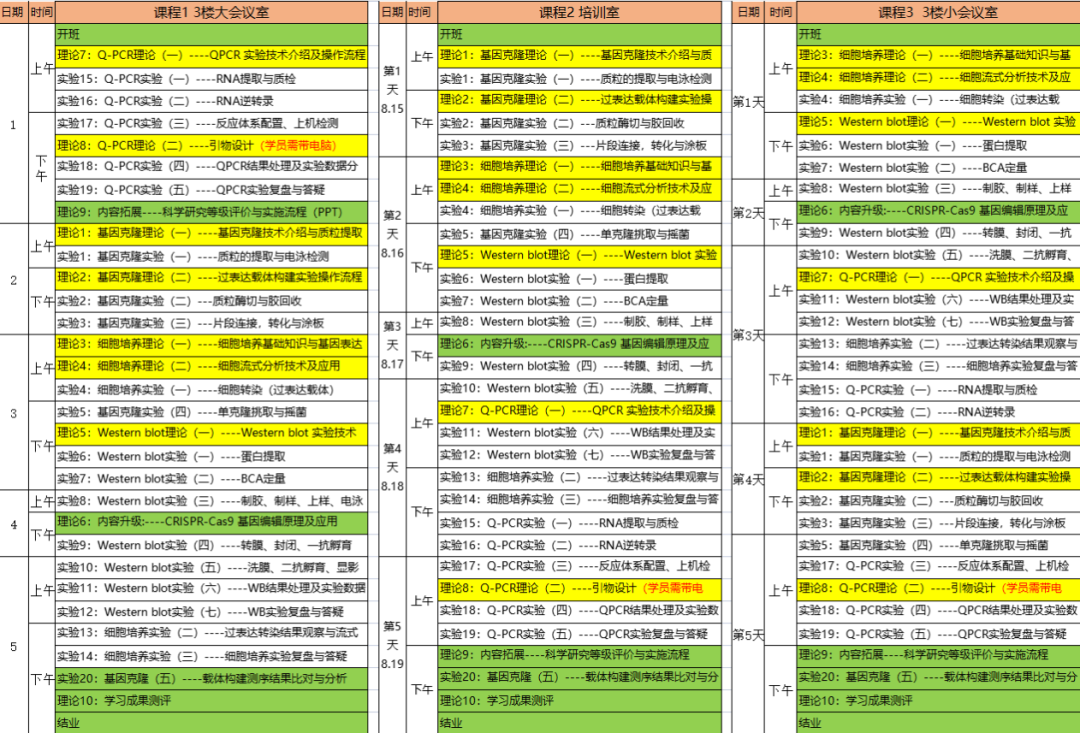 這就是我們《分子細(xì)胞培訓(xùn)五天小班制》課程的內(nèi)容啦,學(xué)習(xí)內(nèi)容不但豐富包含:QPCR、基因克隆、細(xì)胞培養(yǎng)、WB實驗的理論和實驗室實操帶教演練及學(xué)習(xí)成果檢測,可以說能做到快速入門到上手操作,想了解其它課程表或?qū)ο雽ψ约簩W(xué)習(xí)的內(nèi)容定制化的可以報名私人定制班。
