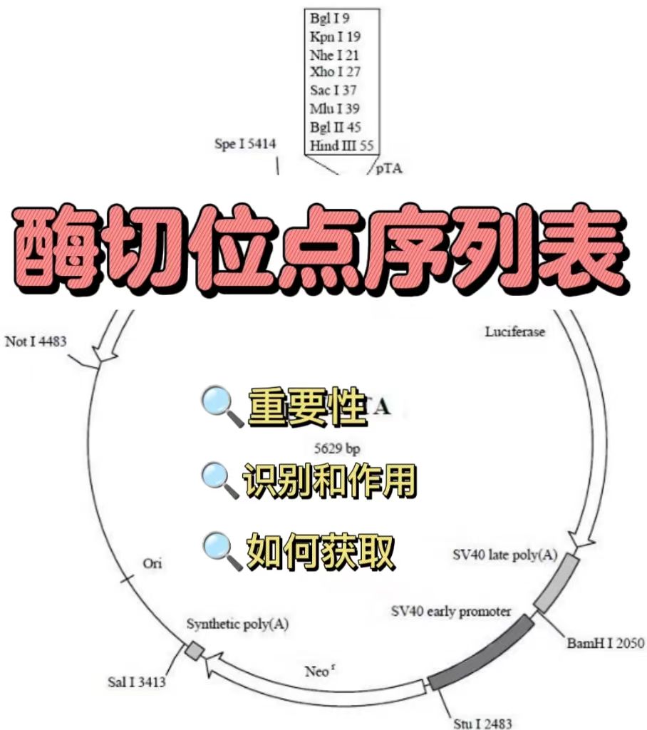 酶切位點(diǎn)序列表由普拉特澤生物技術(shù)為大家總結(jié)分享。本文是關(guān)于酶切位點(diǎn)的最后一篇介紹,前面我們學(xué)習(xí)了怎么看質(zhì)粒上的酶切位點(diǎn)?、酶切位點(diǎn)怎么設(shè)計(jì)?、酶切位點(diǎn)與識(shí)別位點(diǎn)有區(qū)別嗎?常見酶切位點(diǎn)以及保護(hù)堿基,酶切位點(diǎn)怎么判斷?可以點(diǎn)擊標(biāo)題直接傳送回去學(xué)習(xí)的哦。普拉特澤生物分子檢測平臺(tái)承接酶切位點(diǎn)實(shí)驗(yàn)外包上百例,早就為大家把實(shí)驗(yàn)過程中要踩的雷、吃的虧幫大家吃完了,現(xiàn)在我們就來看看關(guān)于酶切位點(diǎn)序列表吧!