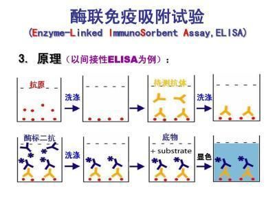 ELISA試驗基于抗原-抗體特異性結合的原理,通過酶標記的二抗與一抗結合,形成酶標抗體-抗原-抗體復合物。隨后,加入底物使酶發(fā)生催化作用,生成有色產物,產物的顏色深淺與待測樣品中抗原或抗體的濃度成正比。通過比色測定,可以實現(xiàn)對目標分子的定量分析