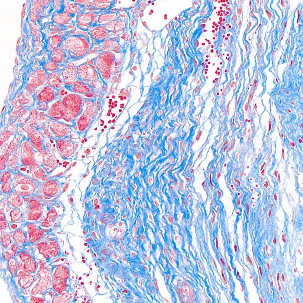 首先,讓我們深入探討MASSON染色的原理。MASSON染色的原理與陰離子染料分子的大小和組織的滲透性密切相關(guān)。染料的分子量決定了其穿透組織的能力:小分子量的染料更容易穿透結(jié)構(gòu)致密、滲透性較低的組織,而大分子量的染料則更傾向于進入結(jié)構(gòu)疏松、滲透性較高的組織。在MASSON染色中,由于肌纖維間隙較小,而膠原纖維間隙較大,因此小分子量的麗春紅染料更容易滲透進入肌纖維并使其呈現(xiàn)紅色,而大分子量的苯胺藍染料則主要進入膠原纖維并使其呈現(xiàn)藍色或綠色。