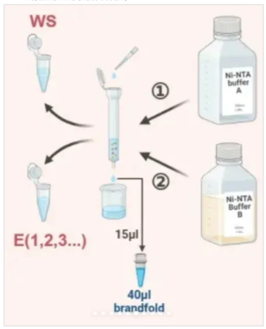 用 Ni-A 緩沖液洗去雜蛋白(收集 WS樣本),再用 Ni-B緩沖液洗脫目的蛋白(收集E樣本),通過 Bradford 試劑監(jiān)測至無雜蛋白釋放。