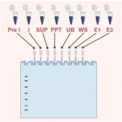 8.變性與電泳將目的蛋白樣本(E)、Pre-1、SUP、PPT.UB、WS 等分別加入 Loading Buffer,95°C變性 10 分鐘,使蛋白完全解鏈,隨后進行 SDS-PAGE 電泳(200V,40分鐘),分離不同分子量的蛋白條帶