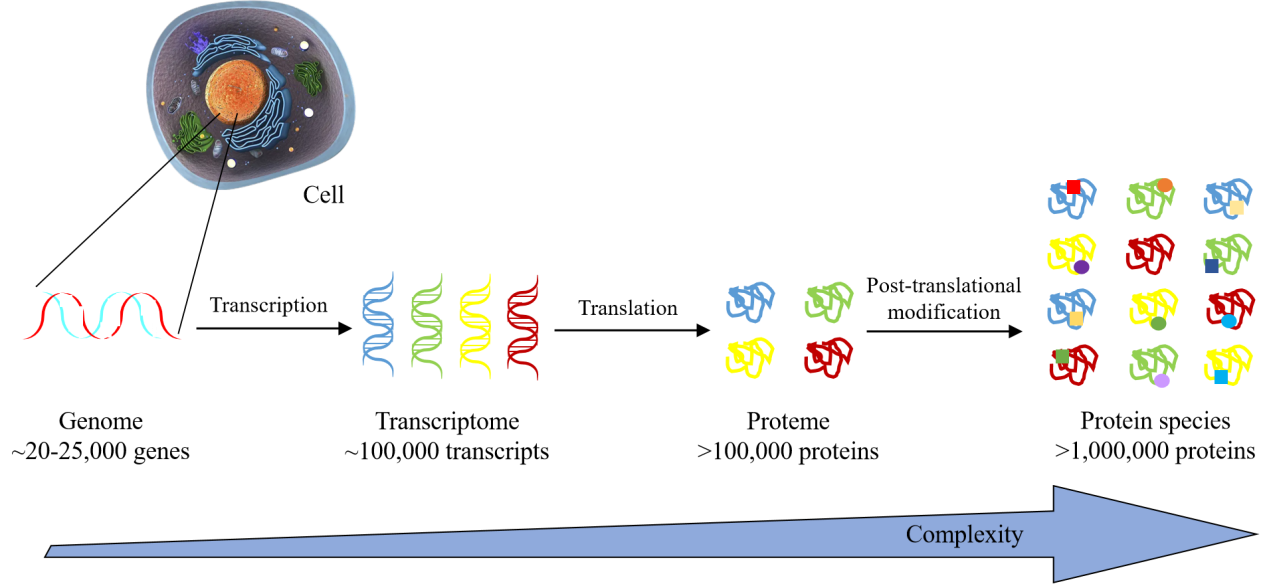 如果說,轉(zhuǎn)錄水平和mRNA 水平的變化增加了轉(zhuǎn)錄組相對于基因組的大小,那么無數(shù)種不同的蛋白質(zhì)翻譯后修飾類型,則使得蛋白質(zhì)組的大小相較于基因組和轉(zhuǎn)錄組呈現(xiàn)指數(shù)型的增加。目前,人體內(nèi)的蛋白質(zhì)總數(shù)已超過一億種??茖W(xué)家們的目光也從基因組水平過渡到了更加復(fù)雜多變的蛋白質(zhì)組,這,是一個必然的研究趨勢。