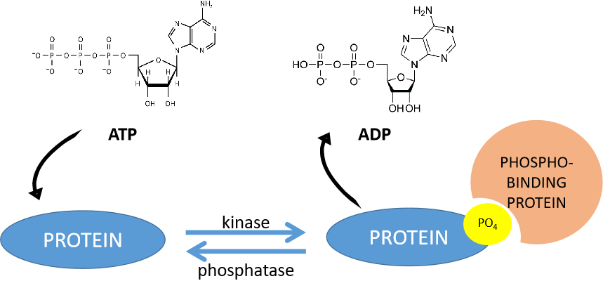蛋白質(zhì)磷酸化是指由蛋白質(zhì)激酶催化的,將ATP(三磷酸腺苷)或GTP(三磷酸鳥苷)上的磷酸基團轉(zhuǎn)移到底物蛋白質(zhì)氨基酸殘基(主要是絲氨酸、蘇氨酸、酪氨酸)上的過程。該過程的逆過程則稱為去磷酸化。添加磷酸基團的酶叫做蛋白激酶,移除磷酸基團的酶叫做蛋白磷酸酶。初高中時期我們學(xué)習(xí)的ATP和ADP的相互轉(zhuǎn)化,應(yīng)該是我們生物學(xué)習(xí)中最早接觸的磷酸化和去磷酸化,也是目前最主要的信號轉(zhuǎn)導(dǎo)方式。