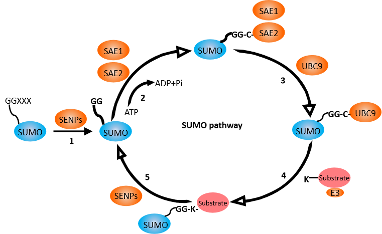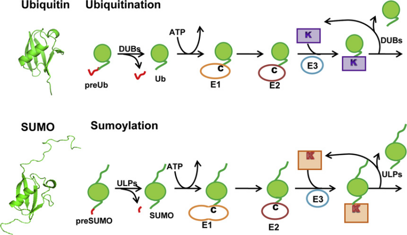 蛋白質(zhì)蘇木化主要包括以下步驟:SUMO前體的成熟、活化、結(jié)合、連接等