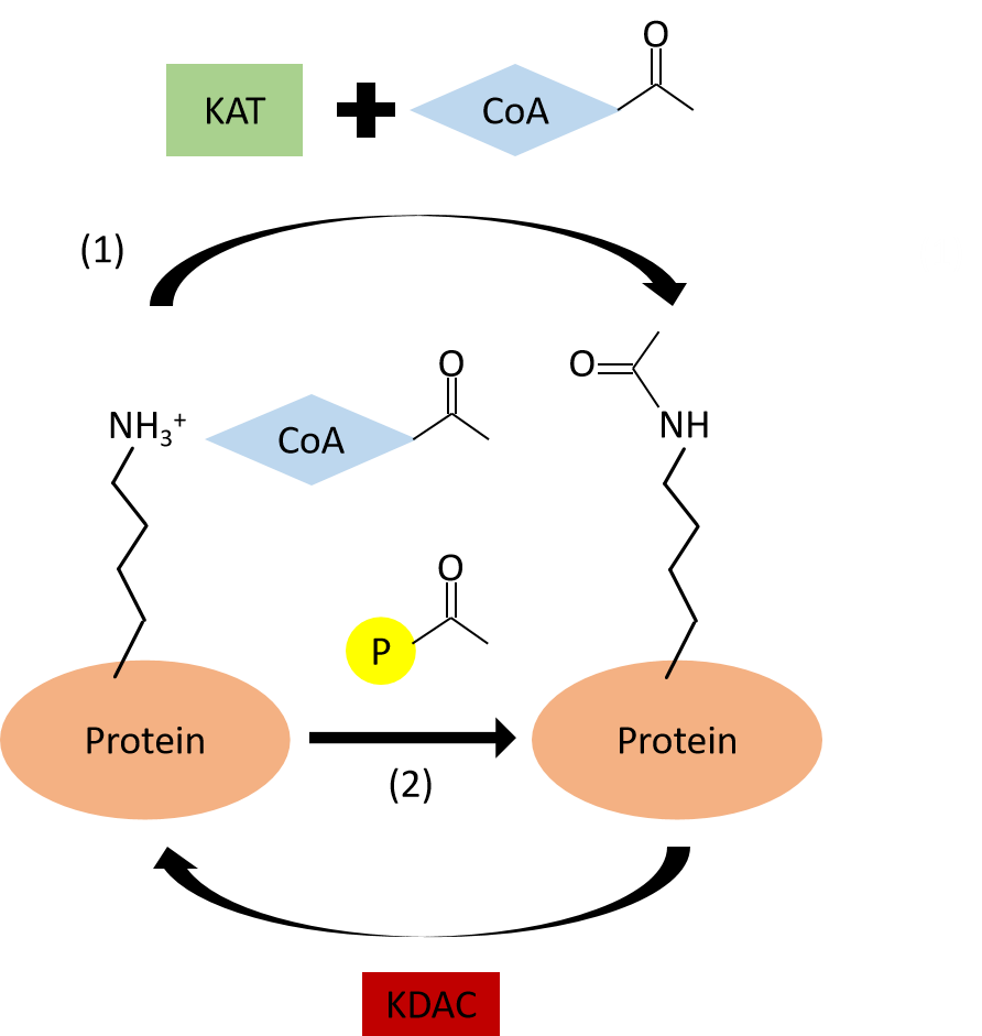 ② 賴氨酸乙?;揎棧菏且粋€可逆的過程,主要由賴氨酸乙酰化酶(KATs)催化乙?;?,賴氨酸去乙?;福?/span>KDACs)催化去乙?;?。