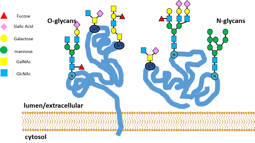 在學(xué)習(xí)糖基化之前我們先來了解一下糖和糖蛋白。糖蛋白是由糖類與蛋白質(zhì)共價結(jié)合的分子,糖類的范圍從單糖到復(fù)雜具有側(cè)鏈結(jié)結(jié)構(gòu)的多糖,種類眾多。而糖基化是一種將糖類分子通過共價鍵連接到蛋白質(zhì)氨基酸殘基上的過程,這個過程通常在內(nèi)質(zhì)網(wǎng)和高爾基體中進(jìn)行,涉及多種糖基轉(zhuǎn)移酶的參與。糖基化過程十分復(fù)雜,目前在很多蛋白中(如轉(zhuǎn)錄因子、熱休克蛋白、核小孔蛋白、RNA聚合酶II、致癌基因翻譯產(chǎn)物、酶等)都發(fā)現(xiàn)了糖基化這種翻譯后修飾方式。