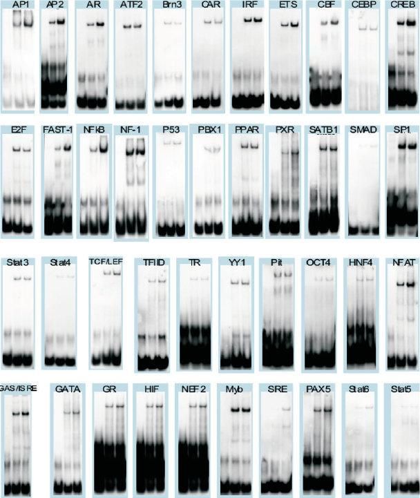 超遷移EMSA凝膠遷移實驗用于研究蛋白質(zhì)與DNA結(jié)合后的構(gòu)象變化。實驗中,將標(biāo)記的DNA片段與待測蛋白質(zhì)混合,形成DNA-蛋白質(zhì)復(fù)合物。然后,通過改變電泳條件(如電場強(qiáng)度、電泳時間等),使復(fù)合物在凝膠中發(fā)生超遷移現(xiàn)象。通過觀察超遷移現(xiàn)象的程度和位置,可以推斷蛋白質(zhì)與DNA結(jié)合后的構(gòu)象變化。