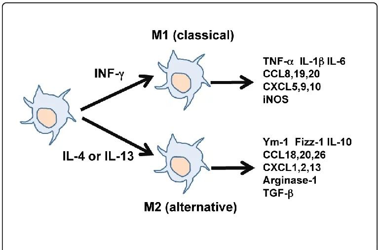 根據(jù)巨噬細(xì)胞的表面標(biāo)志物、細(xì)胞因子分泌及功能特性,可以將其分為兩大類:M1型(經(jīng)典活化型)巨噬細(xì)胞和M2型(替代激活型)巨噬細(xì)胞。