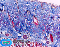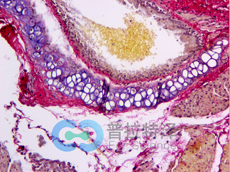 Masson染色預(yù)期結(jié)果:膠原纖維、粘液、軟骨呈藍(lán)色(如光綠液染色為綠色),胞漿、肌肉、纖維素、神經(jīng)膠質(zhì)呈紅色,核黑藍(lán)色。