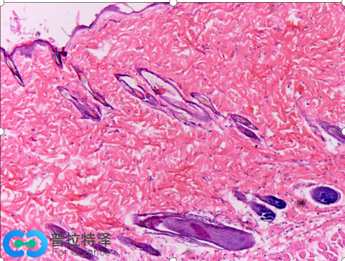 這是小鼠皮膚組織兩種病理染色圖片,左邊是馬松三色染色,右邊是HE染色。