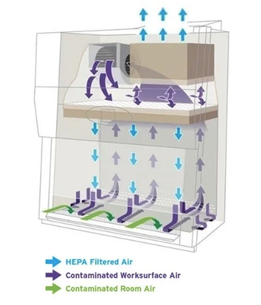 從下方的II級BSC工作原理圖可見,細胞房內(nèi)的空氣經(jīng)過操作臺面前端的氣孔被吸入BSC內(nèi),經(jīng)過內(nèi)部管道流通后,到達操作臺面上方的HEPA濾膜。經(jīng)濾膜過濾后的空氣從上至下吹送至操作臺面。(見下圖)
