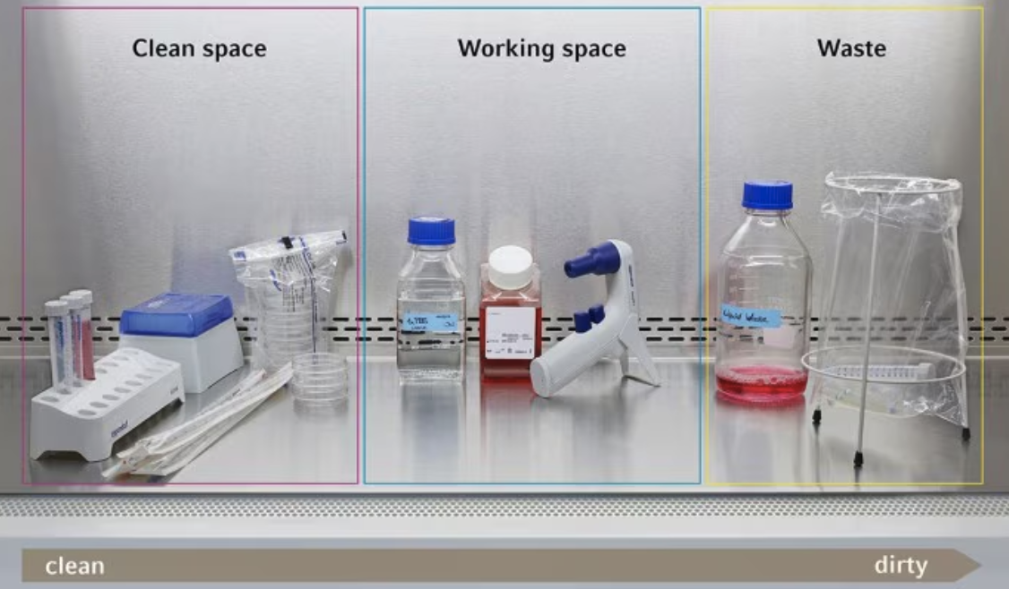 潔凈區(qū)應(yīng)擺放樣品和一次性耗材,例如吸頭、移液管、離心管、培養(yǎng)瓶皿。