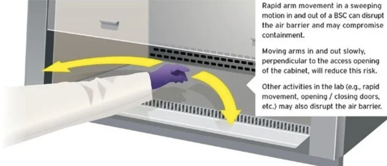 首先,正式操作時,操作者的手會多次伸入臺面,并在里面移動。我們應(yīng)注意:1 手臂應(yīng)與臺面呈垂直方向伸入;2 在內(nèi)部左右移動時速度不要過快(見下圖)。這樣可以盡量降低手臂移動對垂直氣流帶來的擾動。