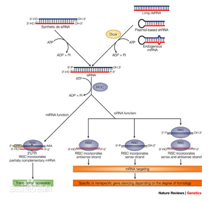 RNAi:是指通過反義RNA與正鏈RNA形成雙鏈RNA特異性地抑制靶基因的現(xiàn)象。可以通過人為地引入與內(nèi)源靶基因具有相同序列的雙鏈RNA(有義RNA和反義RNA),從而誘導(dǎo)內(nèi)源靶基因的mRNA降解,達(dá)到阻止基因表達(dá)的目的。(在細(xì)胞內(nèi)本底表達(dá)非常低的基因不適用)