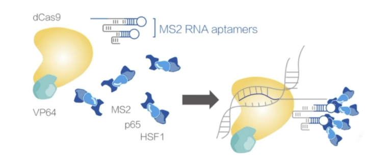 在CRISPRa技術(shù)中,使用的是dCas9蛋白,這是一種經(jīng)過改造的Cas9蛋白,其核酸酶活性被失活,因此無法切割DNA。然而,dCas9蛋白仍然能夠保留其DNA結(jié)合能力,即能夠特異性地識別并結(jié)合到目標(biāo)DNA序列上。為了實(shí)現(xiàn)基因轉(zhuǎn)錄激活,dCas9蛋白被進(jìn)一步改造,與特定轉(zhuǎn)錄激活因子(VP64,MS2等)相融合。當(dāng)我們把gRNA的設(shè)計(jì)在某個(gè)基因的啟動子上,那么這些轉(zhuǎn)錄因子就一股腦的到了這個(gè)啟動子附近,這些轉(zhuǎn)錄激活因子通常具有上調(diào)啟動子的活性,增加轉(zhuǎn)錄