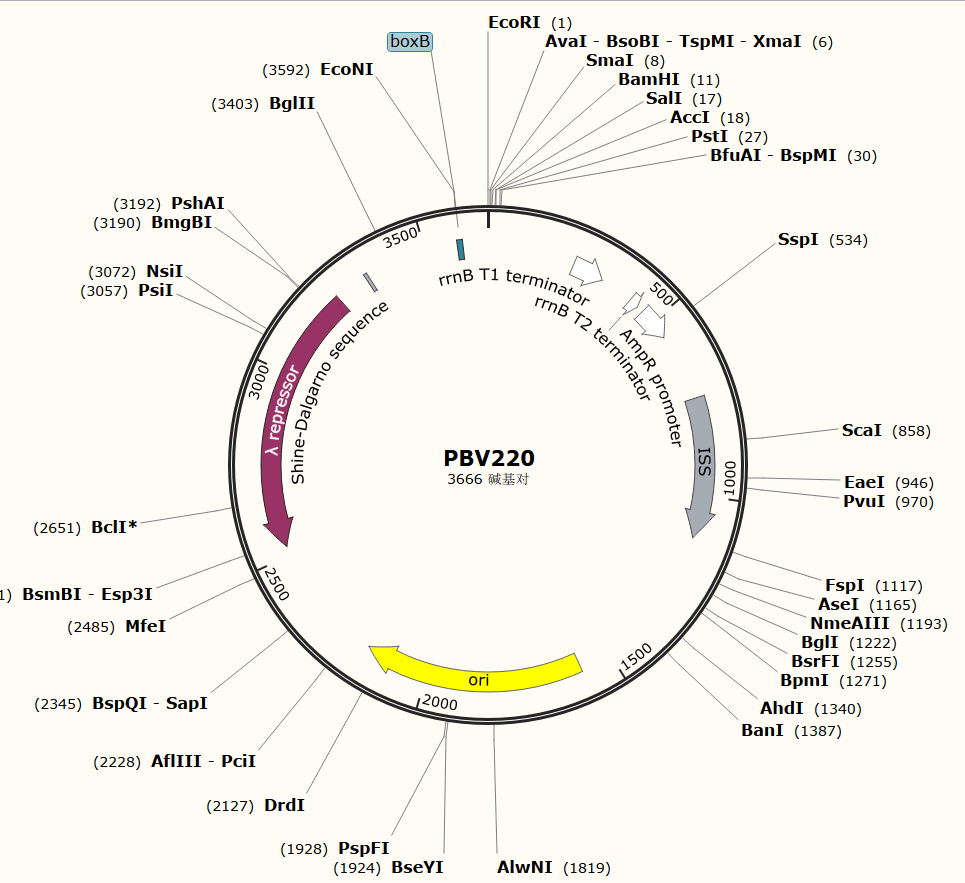常用的非融合型原核表達(dá)系統(tǒng)有:pKK223-3和pBV220系列等。下面以pBV220載體為例。按照定義我們可以得知,非融合型載體不需要帶有標(biāo)簽,因此我們在載體中也就看不到相應(yīng)的類似于His或者GST這類的標(biāo)簽,表達(dá)出來的蛋白就是只有目的蛋白,因此后續(xù)也不需要利用標(biāo)簽進(jìn)行純化。原核表達(dá)
