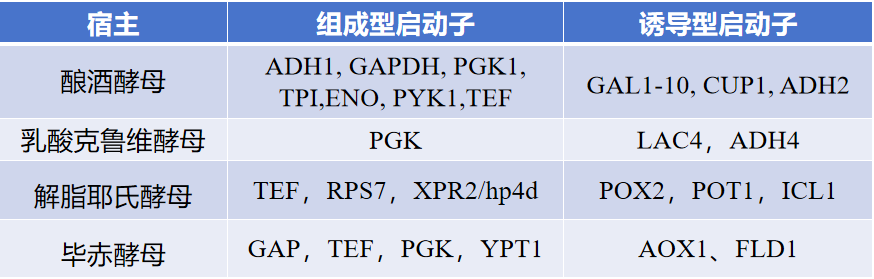 在釀酒酵母和乳酸克魯維酵母中,LEU2基因和G418抗性基因是最常用,對于解脂耶氏酵母,主要使用LEU2和URA3基因。而在畢赤酵母中,最常使用的篩選標(biāo)記是HIS4和zeocin。調(diào)控序列包括啟動子、ARS(酵母復(fù)制起始區(qū))等,其中啟動子可分為兩類(組成型啟動子和誘導(dǎo)型啟動子)。組成型啟動子提供簡單性和相對恒定的表達(dá)水平,而當(dāng)需要分離生長和生產(chǎn)時通常使用誘導(dǎo)型啟動子,這能防止無意中選擇生長較快的非重組細(xì)胞或產(chǎn)生毒性蛋白。不同的受體細(xì)胞常用的啟動子如表中所示。