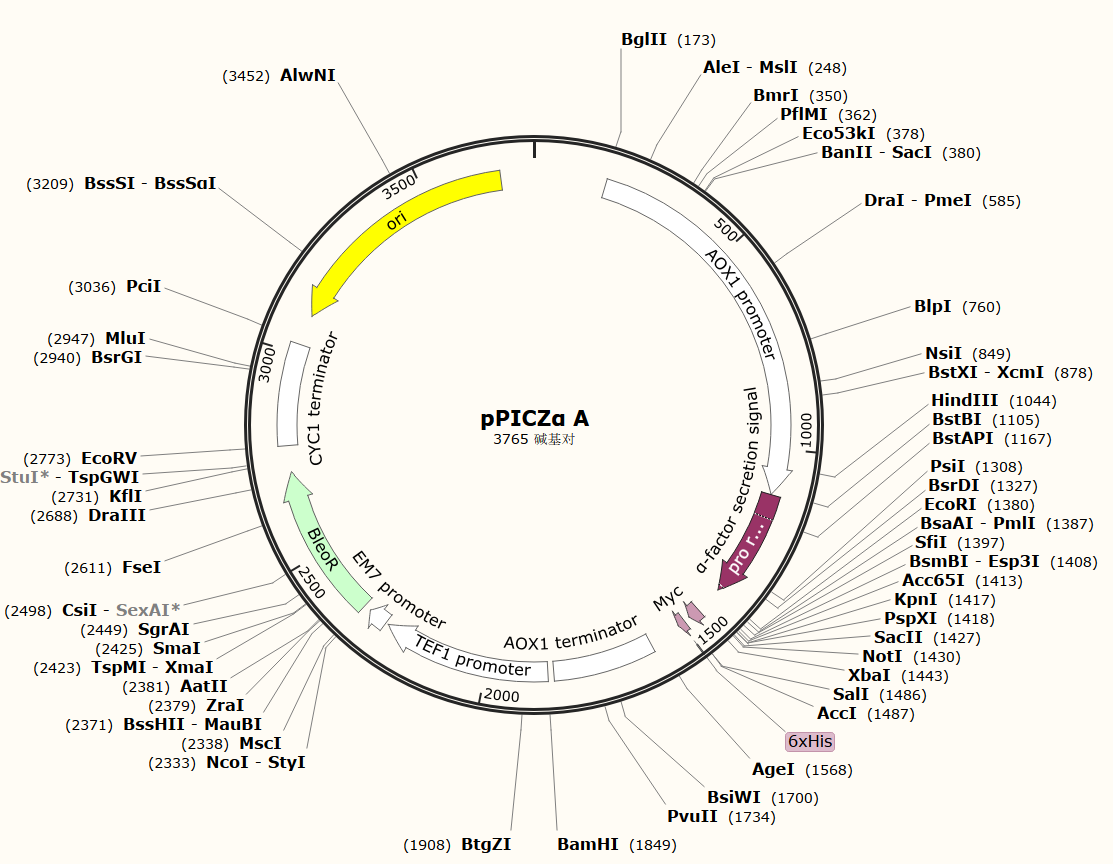 畢赤酵母分泌表達(dá)載體的一個典型例子是pPICZα 系列載體,該系列包含A、B和C載體。下圖是pPICZα A的載體圖譜,我們一個個元件來看:pPICZα A載體包含以下元素:AOX1 啟動子(對相關(guān)基因進(jìn)行嚴(yán)格調(diào)控,位于載體的5'端,是一個嚴(yán)格調(diào)控的啟動子,能夠利用甲醇誘導(dǎo)高效表達(dá)目的基因)、用于重組蛋白分泌的α-因子分泌信號(編碼釀酒酵母α-因子分泌信號,該信號序列能夠引導(dǎo)重組蛋白的分泌性表達(dá)。這段前導(dǎo)肽序列在蛋白質(zhì)翻譯過程中被合成,并作為信號肽引導(dǎo)新合成的蛋白質(zhì)通過細(xì)胞膜的分泌途徑。在分泌過程中,信號肽被特定的酶切割,而重組蛋白的其余部分則被釋放到細(xì)胞外。)、BIeoR博來霉素抗性基因(用于大腸桿菌和畢赤酵母中的篩選,該基因的序列使得攜帶pPICZα A載體的細(xì)胞能夠在含有博來霉素的培養(yǎng)基上生長)、標(biāo)簽的 C 端肽用于檢測和純化重組融合蛋白(包括Myc和His標(biāo)簽,這些標(biāo)簽位于目的基因的下游,用于重組蛋白的檢測和純化,同時Myc和His標(biāo)簽的序列是已知的,可以在蛋白質(zhì)純化過程中作為識別和結(jié)合的靶點)、AOX1轉(zhuǎn)錄終止子(位于載體的3'端,確保mRNA的正確終止,轉(zhuǎn)錄終止子序列包含特定的終止信號,如多聚腺苷酸化信號等,polyA尾巴是真核生物特有的,在也是成熟信使RNA的標(biāo)志之一,也是咱們判斷一個載體是不是真核載體的一個標(biāo)準(zhǔn))。