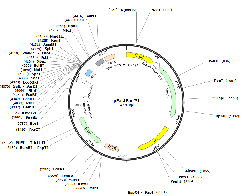 Bac-to-Bac表達(dá)系統(tǒng):根據(jù) F 因子載體原理,用類似于酵母體內(nèi)重組的方法,構(gòu)建了一種桿狀病毒穿梭載體Bacmid。常用的載體為pFastBac載體該載體可像質(zhì)粒一樣在大腸桿菌中生長,又對鱗翅目昆蟲細(xì)胞具有感染性。Bacmid含有 F 因子復(fù)制子( 可在大腸桿菌中復(fù)制) 、卡那霉素抗性基因,同時包含Tn7轉(zhuǎn)座元件,這是一種能夠?qū)⒛康幕蛲ㄟ^轉(zhuǎn)座方式整合到大腸桿菌Bacmid質(zhì)粒上特定位點的元件(轉(zhuǎn)座是指DNA序列在基因組中從一個位置移動到另一個位置的過程,這個過程涉及到DNA序列的復(fù)制(在某些類型的轉(zhuǎn)座中)和隨后在基因組新位置的插入。轉(zhuǎn)座是生物體內(nèi)一種重要的遺傳變異機(jī)制,能夠?qū)е禄蚪M的重排和基因表達(dá)的調(diào)控變化。轉(zhuǎn)座子則是執(zhí)行轉(zhuǎn)座過程的DNA序列),這一特性使得pFastBac載體能夠方便地與Bacmid穿梭載體結(jié)合,進(jìn)而在昆蟲細(xì)胞中產(chǎn)生重組病毒。