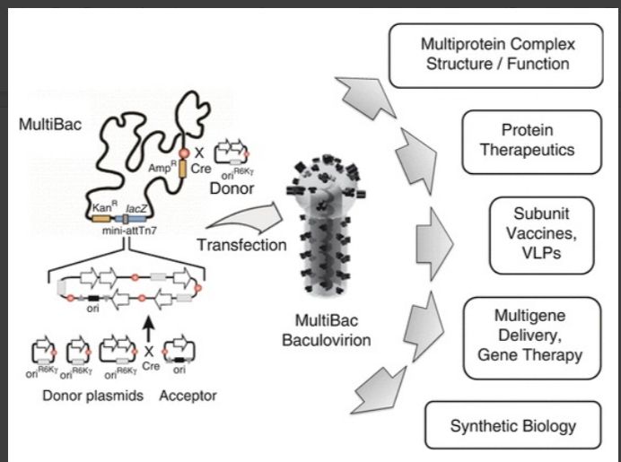MultiBac表達(dá)系統(tǒng):MultiBac是一種先進(jìn)的桿狀病毒/昆蟲細(xì)胞系統(tǒng),已被開發(fā)并用于生產(chǎn)具有許多亞基的多蛋白復(fù)合物,用于學(xué)術(shù)和工業(yè)研究與開發(fā)。MultiBac由針對蛋白質(zhì)復(fù)合物生產(chǎn)進(jìn)行優(yōu)化的工程桿狀病毒組成。這種MultiBac桿狀病毒基因組以大腸桿菌中的細(xì)菌人工染色體(BAC)存在。它包含兩個外源基因整合位點,通過Tn7,或者通過Cre酶介導(dǎo)的位點特異性重組。MultiBac進(jìn)一步由一系列質(zhì)粒組成,這些質(zhì)粒稱為受體和供體,可促進(jìn)多基因組裝。MultiBac桿狀病毒(中心)是通過在昆蟲細(xì)胞中轉(zhuǎn)染復(fù)合MultiBac BAC產(chǎn)生的。MultiBac已成功用于基礎(chǔ)和應(yīng)用研究與開發(fā)中的各種應(yīng)用程序。目的基因顯示為白色箭頭。紅色圓圈表示LoxP。復(fù)制起點顯示為矩形。