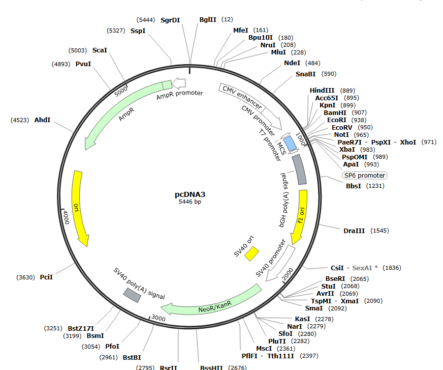(1)非病毒載體:由真核復(fù)制信號、啟動子、轉(zhuǎn)錄單位以及質(zhì)粒片段組成,不需要包裝細(xì)胞,比如pSV系列、pCDNA3等。接下來介紹一下常用的pcDNA3載體。pcDNA3載體可用于在多種哺乳動物細(xì)胞系中實現(xiàn)高水平、組成型表達(dá)。包含可選標(biāo)記物和多克隆位點,具有以下特點:具備高水平表達(dá)蛋白的巨細(xì)胞病毒(CMV)增強(qiáng)子啟動子;正向 (+) 或反向 (-) 的大分子多克隆位點;牛生長激素(BGH)多聚腺苷酸化信號和轉(zhuǎn)錄終止序列用于增強(qiáng)mRNA穩(wěn)定性;氨芐青霉素耐藥基因和pUC復(fù)制區(qū)序列用于大腸桿菌中的選擇和維持。