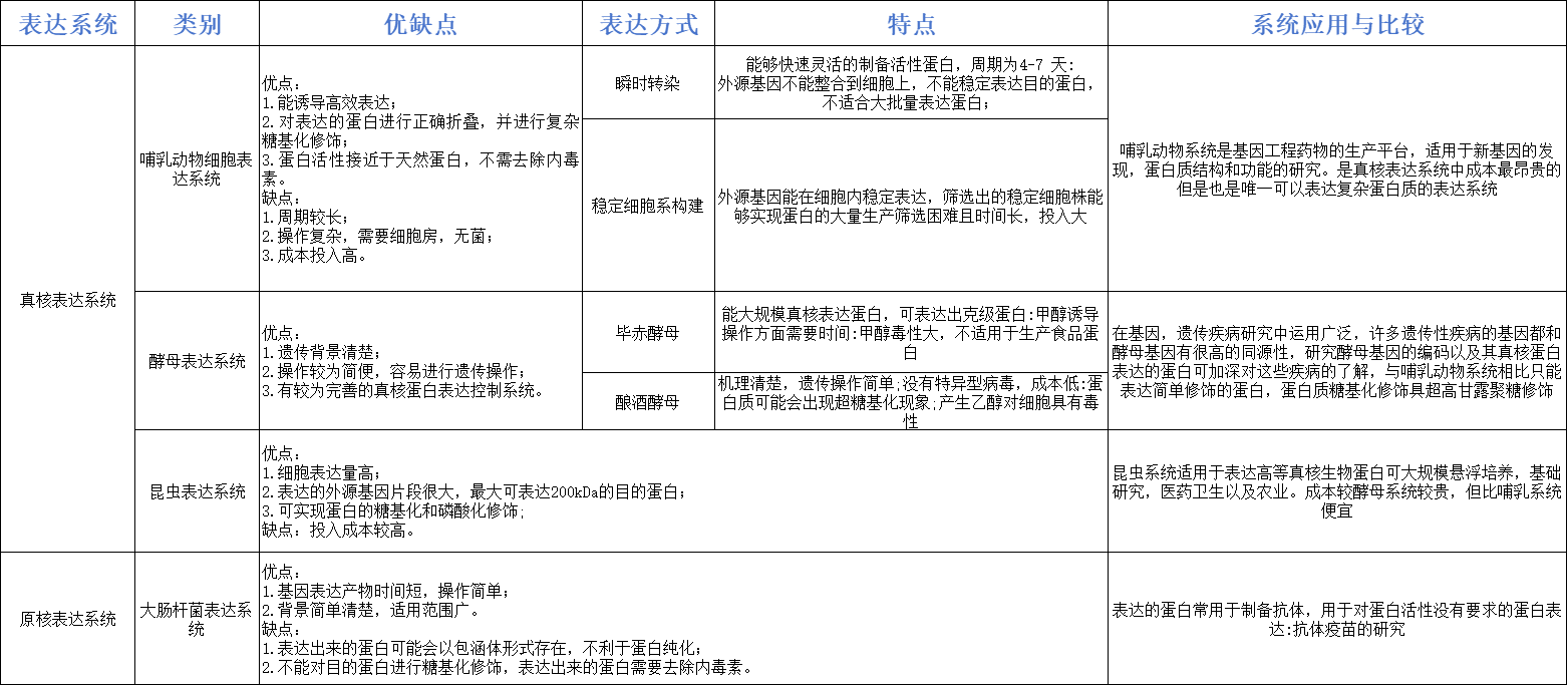 大腸桿菌表達(dá)體系通常適用于對于較少需要翻譯后修飾的胞質(zhì)蛋白,因為大腸桿菌蛋白質(zhì)合成和修飾機(jī)制相對簡單,缺乏真核生物中復(fù)雜的翻譯后修飾系統(tǒng),如糖基化、磷酸化等高級修飾過程,同時對于一些跨膜蛋白、糖蛋白以及和細(xì)胞膜結(jié)合的蛋白不太適合大腸桿菌的表達(dá)體系,因為大腸桿菌沒有內(nèi)質(zhì)網(wǎng)等細(xì)胞器來促進(jìn)蛋白結(jié)構(gòu)的正確翻譯折疊。因此,如果要表達(dá)真核生物的某些類型蛋白時,原核表達(dá)體系就失去了它的優(yōu)勢。那接下來就來看看真核表達(dá)體系。
