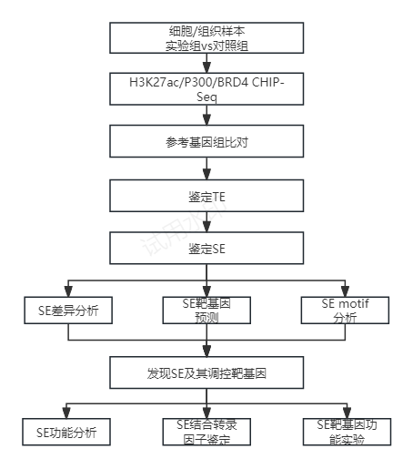 我們要研究某個基因的增強子和超級增強子的功能,首先需要用實驗(如經(jīng)典的ChIP-seq實驗)來識別目的樣本中的增強子序列(增強子一般具有組織或細胞特異性,許多增強子只在某些細胞或組織中表現(xiàn)活性);然后基于基因敲除或基因干擾技術(shù),研究SE的功能。