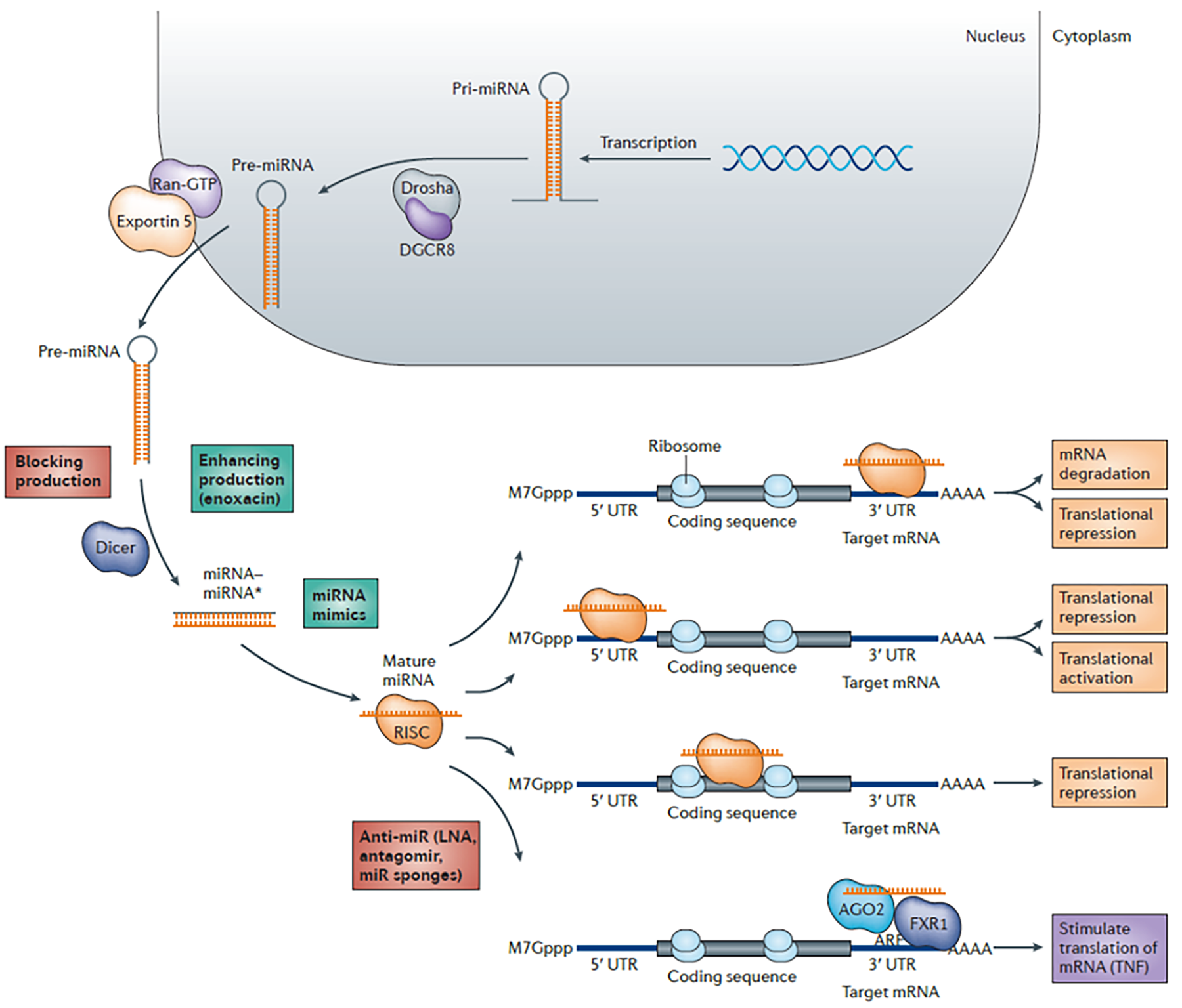 miRNA與蛋白質(zhì)編碼基因的3'非翻譯區(qū)(3'UTR)的相互作用被認(rèn)為是miRNA的主要作用機(jī)制,其通常通過mRNA降解或通過翻譯抑制導(dǎo)致蛋白質(zhì)輸出的降低。也有研究表明miRNA可以通過互補(bǔ)性與蛋白質(zhì)編碼基因的5'UTR相互作用,并引起靶向蛋白質(zhì)的翻譯抑制或激活。同樣,miRNA也可以靶向編碼序列并抑制靶基因的翻譯。此外,一些miRNA可以與調(diào)節(jié)蛋白復(fù)合物相互作用,如Argonaute 2(AGO2)和FXR1,并間接上調(diào)靶基因的翻譯
