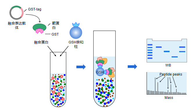 基本原理:將靶蛋白-GST 融合蛋白親和固化在谷胱甘肽親和樹(shù)脂上,作為與目的蛋白親和的支撐物,充當(dāng)一種“誘餌蛋白”,目的蛋白溶液過(guò)柱,可從中捕獲與之相互作用的“捕獲蛋白”(目的蛋白),洗脫結(jié)合物通過(guò) SDS-PAGE 電泳分離,最后經(jīng)western blot或質(zhì)譜分析,從而證實(shí)兩種蛋白間的相互作用;