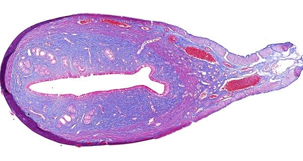 Masson染色時(shí)膠原纖維呈藍(lán)色(被苯胺藍(lán)所染)或綠色(被亮綠所染),肌纖維呈紅色(被酸性品紅和麗春紅所染),這與陰離子染料分子的大小和組織的滲透性有關(guān)。如已固定的組織用一系列陰離子水溶性染料先后或混合染色,則可發(fā)現(xiàn)紅細(xì)胞被最小分子的陰離子染料著染,肌纖維與胞質(zhì)被中等大小的陰離子染料著染,而膠原纖維則被大分子的陰離子染料著染。由此說(shuō)明了紅細(xì)胞對(duì)陰離子染料的滲透性最小,肌纖維與胞質(zhì)次之,而膠原纖維具有最大的滲透性。根據(jù)組織不同的滲透性能,選擇分子大小不同的陰離子染料進(jìn)行染色,便可把不同組織成分顯示出來(lái)。
