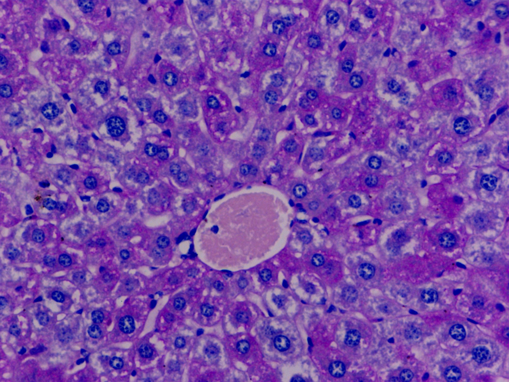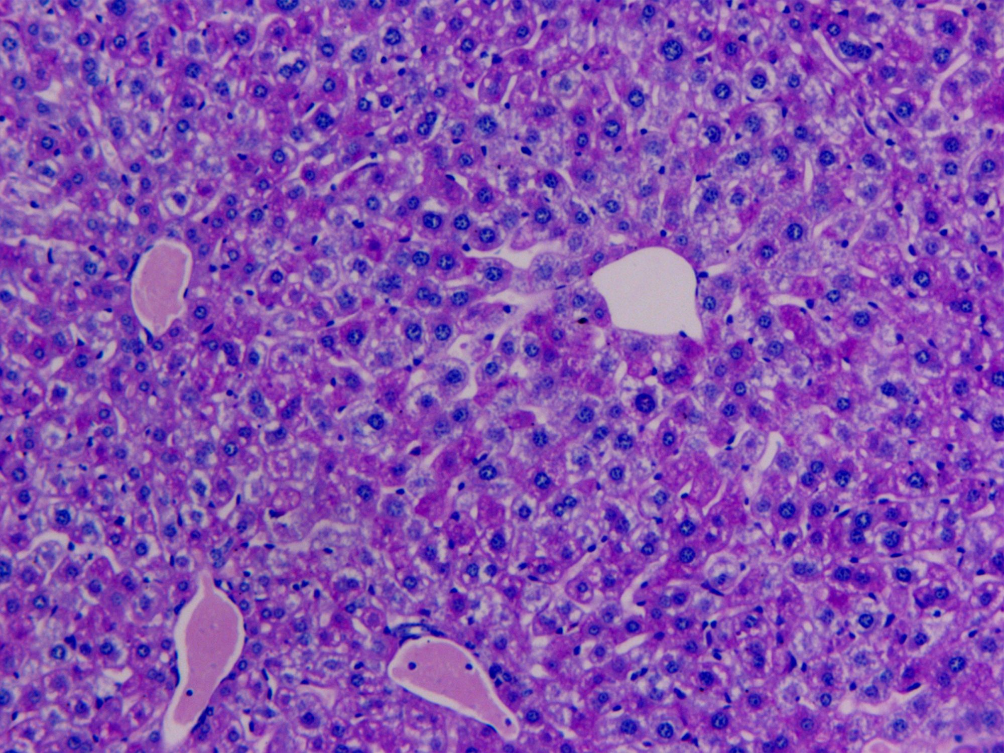 PAS染色糖原染色是病理學(xué)中常規(guī)的染色方法之一,氧化劑能氧化糖類及有關(guān)物質(zhì)中的1,2-乙二醇基,使之變?yōu)槎?,醛與Schiff試劑能結(jié)合成一種品紅化合物,產(chǎn)生紫紅色。PAS技術(shù)常用來顯示糖原和其他多糖,該染色液不僅能夠顯示糖原,還能顯示中性黏液性物質(zhì)和某些酸性物質(zhì),以及軟骨、垂體、霉菌、真菌、色素、淀粉樣物質(zhì)、基底膜等。