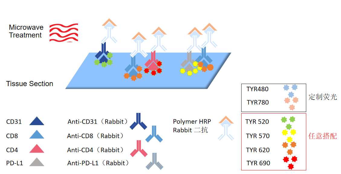 酪酰胺信號(hào)放大 (TSA) 技術(shù)是一類利用辣根過氧化酶 (HRP) 對(duì)靶蛋白進(jìn)行標(biāo)記的酶學(xué)檢測(cè)方法,類似常規(guī)免疫組化的DAB顯色方法,TSA技術(shù)同樣采多聚HRP的二抗,同樣有對(duì)應(yīng)的“顯色”步驟,HRP催化加入反應(yīng)體系的酪胺熒光素底物,產(chǎn)生活化熒光底物,活化底物可與抗原上的酪氨酸等殘基共價(jià)結(jié)合,使樣品上穩(wěn)定的共價(jià)結(jié)合酪胺熒光素。之后用熱修復(fù)法洗去非共價(jià)結(jié)合的一抗-二抗-HRP復(fù)合物,重復(fù)下一種一抗-HRP二抗來(lái)第二輪孵育,換另一種酪胺熒光素底物,如此往復(fù)就可實(shí)現(xiàn)多重標(biāo)記。