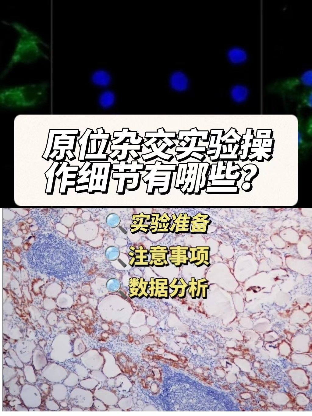 原位雜交(in situ hybridization)是應(yīng)用已知堿基順序并帶有標(biāo)記的核酸探針與組織、細胞等樣本中待測目的基因按堿基配對原則進行特異性結(jié)合而形成的雜交體,然后再用與標(biāo)記物相應(yīng)的檢測方法,在被檢測的核酸原位形成帶顏色的雜交信號,從而在顯微鏡下進行目的基因的定位檢測觀察。主要檢測方法分為DAB顯色和熒光顯色兩種。